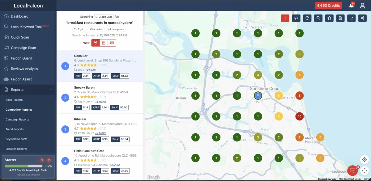 Below is a real-time Google maps scan of one of our Maroochydore cafe client (Coca Bar, Sunshine Plaza) using a tool called LocalFalcon. After 30 days of targeted Google Business Profile optimisation, weekly posts, fresh geo-tagged photos, fast review replies, and simple on-page SEO tweaks, they now own the #1 spot on Google Maps across Twin Waters down to Alexandra Headland, (all the green dots). More direction requests, more walk-ins, zero ad spend. That’s the power of proper local SEO, and it’s exactly what we do for every Sunshine Coast business we work with.